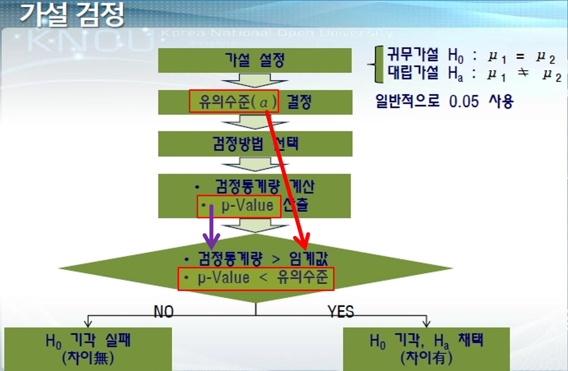 - 통계적 가설검정에서는 귀무가설을 받아들일 것인지, 아니면 기각할 것인지를 검증